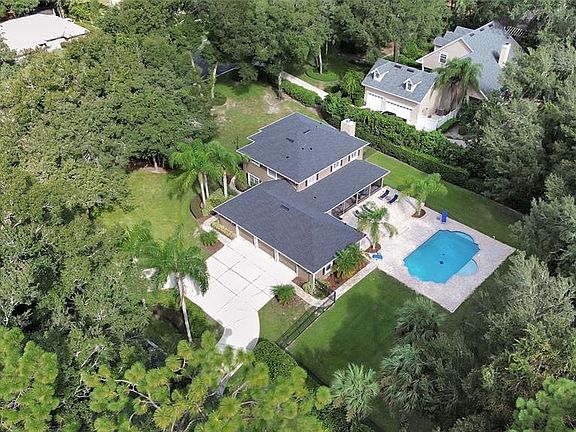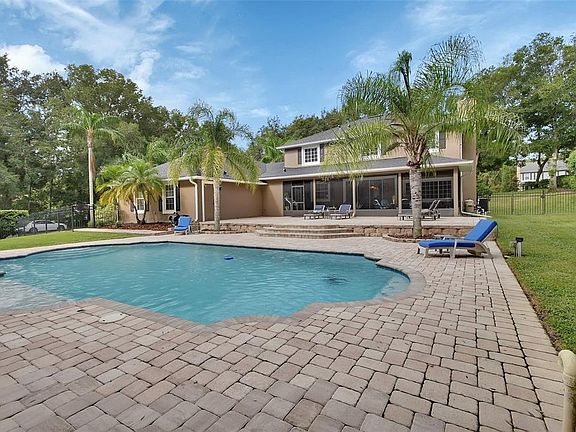 First Time on the Market – One Owner Custom Arthur Rutenberg POOL Home, OVERSIZED 3 Bay attached GARAGE, on .91 ACRE. You will know this is a special place when you see the huge live oak welcoming you in. This sprawling oak is hundreds of years old. Pride of ownership shines in this one-owner, custom-built 5BR/3BA home designed with quality and detail throughout. This two story beauty is constructed with cement BLOCK on both levels (no wood frame), offering long-lasting strength and style. Enjoy peace of mind with NEW roof, new hot water heater, two new HVAC systems, new toilets, updated electric inside & out, resurfaced pool with new pump. Remodeled kitchen & baths (2023). Inside, you’ll find: Spacious first floor ACTIVITY/GAME Room with rich cherry wood floors, and a wall of closets for storage. Crown moulding & wood-look ceramic tile in main living areas. Great Room (Family Room) with wood-burning fireplace and cherry floors. Formal Dining Space and separate Dinette plus a beautiful Breakfast Bar Island lets you entertain with flexibility. Gourmet kitchen with stainless appliances, granite counters, cabinets with glass front tops, farmhouse sink, oversized breakfast island with storage, and large hall pantry. Triple disappearing sliders open the home to a stunning 12x36 screened lanai with trussed roof, porcelain tile, and 220 hook-up for a hot tub. The lanai overlooks the 20x44 open paver patio and steps down to the 18x30 sparkling pool with full paver deck — perfect for entertaining or relaxing. There is a first floor pool bath with shower tub combo, dual sinks and granite counters, that also serves guests. Upstairs, the PRIMARY SUITE offers vaulted ceilings, french doors to 8x5 deck/sitting porch to catch the last rays of the setting sun, an EN-SUITE bath with private garden tub and glass block window lighting, large walk-in shower, double sinks, granite counters, dual closets, private water closet. Hall bathroom strategically located on 2nd floor for guests has dual sinks, granite counters and shower tub combo. All guest bedrooms are bamboo or LVP flooring, have closets with mirrored doors and are comfortably sized. Car enthusiasts will love the oversized garage which can hold 5 vehicles. Garage also offers 2 sets of pull down stairs for attic access/storage. This rare gem blends timeless craftsmanship with modern updates, making it the perfect place to call home. Don’t miss your chance to own this one-of-a-kind Arthur Rutenberg masterpiece!