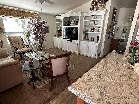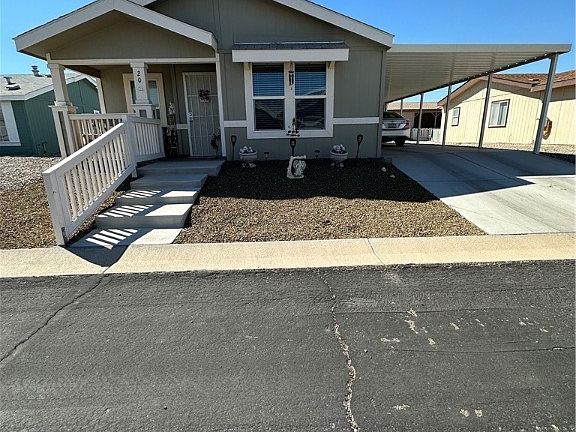 Look no further!!! Beautiful 2 bedroom/2 bath home in Arrowhead Ranch MH Community. Home has a cozy front porch to enjoy the Arizona climate, a full length covered carport and storage shed, and rock landscaping all around. The kitchen has lots of cabinets, a kitchen island for prepping or sitting, spacious eat in dining, and includes the refrigerator, gas range, and dishwasher. The primary suite has a walk-in closet, walk-in shower, and separate water closet. This home also has an extraordinary homebuilt entertainment center. The washer and dryer, included, are located inside the home. The land does not convey. The current lot rent is $475.00 per month. The lot rent includes use of all amenities by the resident. There is an indoor/outdoor heated pool (heated to 86 degrees), a hot tub, common/meeting room/ rec room with pool tables, chess and checkers, big screen tv, books and puzzles galore. This is a very active community with a full calendar of events. The paved streets, underground utilities, and street lights make it a fun safe place to walk or bike.