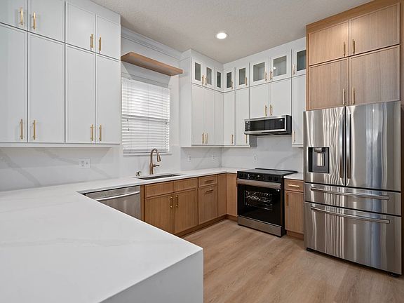 Step into this beautifully remodeled home showcasing high-end finishes, brand-new kitchen appliances, and designer touches throughout. The open-concept kitchen features soft-close cabinetry, brushed gold hardware, and lighted cabinets that reach all the way to the ceiling, offering both style and extra storage. Elegant new lighting brightens the main floor, creating a warm and welcoming atmosphere.