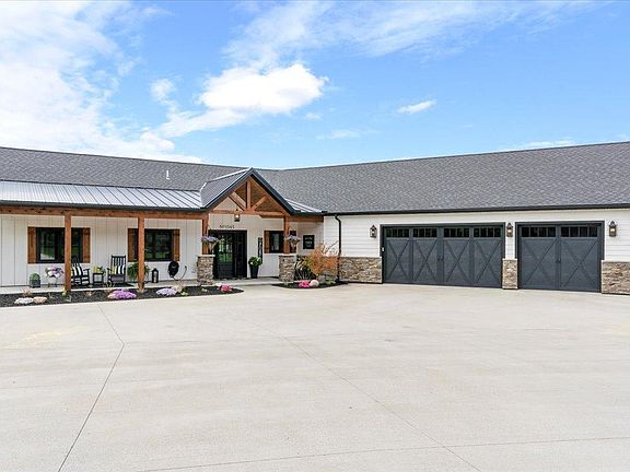 The heated 3-car garage (1,200 sq ft) includes RV parking with a dump station, an oversized driveway, and in-floor heat in both the home and garage. Additional features include upgraded electrical, plumbing, lighting, a rock-accented front entry, carriage-style garage doors, and full gutter system.