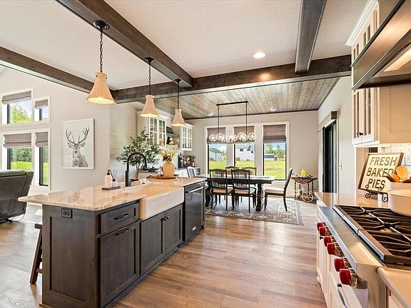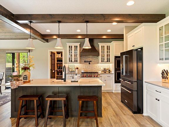 The heart of the home features a gourmet kitchen complete with Cambria quartz countertops, dual KitchenAid ovens, a 3-drawer fridge, wine fridge, microwave drawer, Wolf cooktop, pot filler, and a stunning wood hood vent. A spacious butler’s pantry with appliance cabinet makes entertaining effortless.