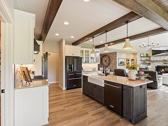 Relax in the spacious living room with a 42” fireplace adorned with full brick surround and stone hearth. Wood beams, shiplap walls, barn doors, and a glass front door with sidelights add charm and style throughout.