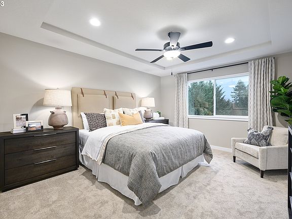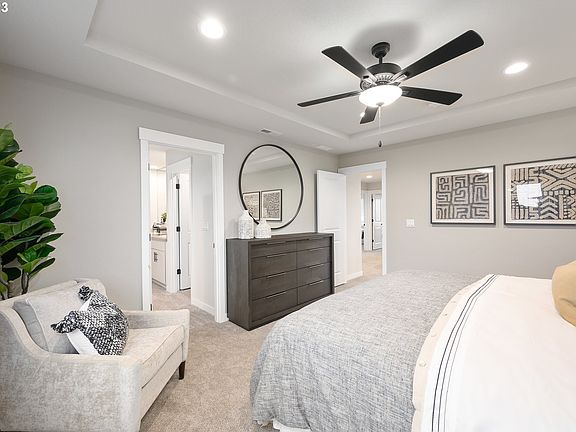 4 bedrooms, 2.5 bathrooms and a loft. Kitchen with Quartz countertops, gas stainless steel appliances. Great room concept with cozy gas fireplace. Walk out to covered patio and fully fenced back yard! Spa-like primary suite separate shower, soaking tub, dual sinks and walk-in closet. Interior photos of model home