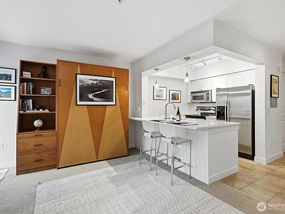 Tastefully updated studio (possible pied-à-terre?) at Ballard Place, including a $9,000 Murphy bed with matching custom shelves; and a kitchen with quartz countertops, stainless steel appliances & tray ceiling. Enjoy the comfort of a cozy fireplace, the convenience of in-unit washer/dryer, upgraded bathroom with quartz vanity and tile backsplash, and east-facing balcony. Amenities include a full-time concierge, rooftop deck with views, gym, sauna, lounge, business center, and patio with spas and seating. Designated parking included. In the heart of Ballard within a few blocks of shops, restaurants, bars, cafes, Majestic Bay Theatres, Ballard Farmers Mkt, and public transit. Pet friendly, and no rental cap.