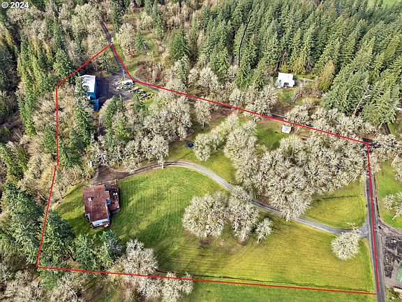 When we say this is a Once in a Lifetime Opportunity to own a property like this, we mean it! This one-of-a-kind estate was loving & thoughtfully hand built w/logs from the property. You will never find another homestead like this. From the moment you arrive you'll be captivated by the grandeur of the views of the Molalla River, Mt. Hood, valley, & secluded park-like setting. This is a property that needs to be seen to truly appreciate the buildings, landscape, and home design. 2 driveways lead to this spectacular 5.7-acre secluded estate with large shops and outbuildings. Resort living in this custom timber home is perfect for entertaining & working from home. You will not want to leave home. Walk into the foyer, step into the formal vaulted living rm w/walls of windows from floor to ceiling, ceiling fan & floor to ceiling stone propane fireplace. Cook's dream gourmet kitchen: granite counter and backsplash, under mount sink, double ovens, gas cook top island, pantry, custom soft close cabinets, and eating nook w/access to huge wrap decking. Formal dining room can seat up to 18 plus, room for China hutch and buffet w/slider to decking/backyard. 3 additional spacious bedrooms on the main floor & laundry. Upper/loft area: vaulted master suite w/sitting area, gorgeous views, private bath, shower/tub, & large walk-in closet. Enjoy the large office/craft/sewing room w/custom cabinets. 16'x23' unfinished attic storage space. Lower-level daylight basement: separate entrance, huge family rm, walls of windows, 5th bedroom, storage, canning room, & full bath. Large 2 + oversized car garage w/storage. Several outbuildings: fenced dog kennel, woodshed, pump house, tree house & cement pad for MFG (hardship) with utilities. Compacted gravel driveway can hold heavy equipment. Too much for this space look under docs for interior & exterior amenities.