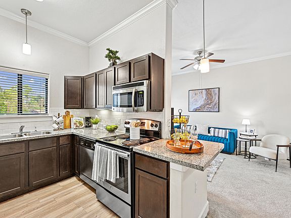 - Exterior features: 10-foot Ceilings, Aerobic Studio, Barbecue, Breakfast bar, Business Center, Coffee & Wine Bar, Game & Craft Room, Granite Countertops, On-Site Maintenance, Outdoor covered seating areas, Pet Park, Spacious Bathrooms, Stainless-Steel Appliances, TV Lounge, Wood-style plank floors