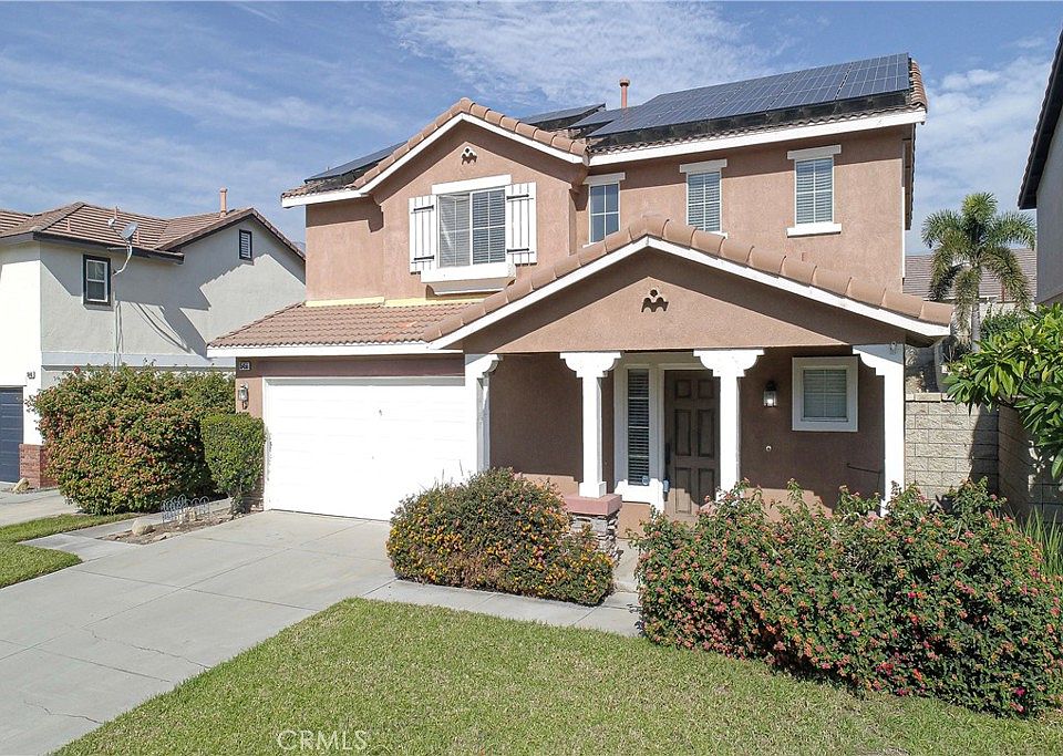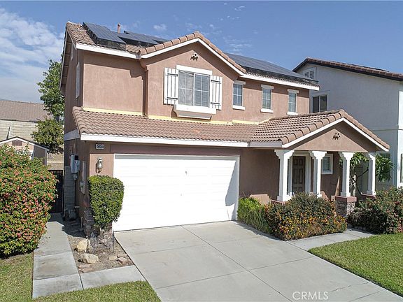 Etiwanda and Chaffey School Districts. Zillow has mapped it incorrectly and has wrong schools for this property, in the process of being corrected. Professional photos and 3D video tour coming in days. Spacious 3 bedroom, 2.5 bath home with bright open floorplan. Family Kitchen, Family room area. Kitchen features stainless steel appliances, White cabinetry and pantry areas, granite counter tops, custom back splash. Sliding door leads to backyard with concrete patio slab and green landscaped grass area, slope with fruit trees ready and plenty of room for planting a garden. Main bedroom suite with private bathroom featuring double sink vanity and double mirror, spacious shower enclosure, and Walk-in closet. Main room with ceiling fan, mirrored closets. Laminate flooring throughout first level of home, carpet upstairs, bedrooms carpeted. Approximately a '12'x9' "Tuff Shed" for extra outside storage. Leased Solar System saves on energy costs. Great school districts, Etiwanda and Chaffey Union School District. Close to shopping and public parks. Easy access to 10 Frwy.