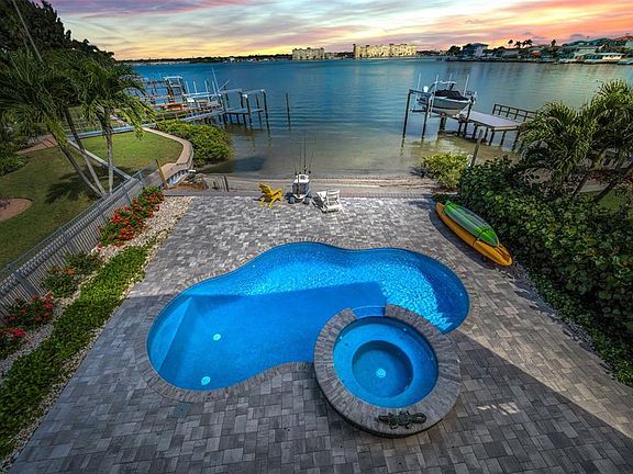 Lounge on your own sandy Beach on Boca Ciega Bay in Madeira Beach, fish from your back yard. Stroll just two short blocks to the Gulf. Walk to shopping and restaurants. Multiple airports are just a short commute away. Minutes away enjoy vibrant Downtown St Petersburg with world class restaurants, museums shopping and The Pier. Almost new, built in 2019, stunning custom designed 2 Bed 2 Bath boasts a very open Beach style floor plan and is move-in ready. The expansive foyer leads to the second story open living space. The elevator makes carrying your packages a breeze. The very spacious living, kitchen and dining areas share expansive and magnificent views of Boca Ciega Bay. Perfect for entertaining and hosting holiday dinners. The center island breakfast bar can be a gathering place for your guests to enjoy conversations. The designer like kitchen features plenty of naturally backlit cabinet space, granite countertops, a large pantry, Viking appliances perfect for any type of Chef. Double sliders open to a 24' x 9' balcony and breathtaking views. A great place to enjoy your morning coffee. The many windows feature plantation shutters throughout, offering the best of privacy or natural light to the enjoy views. A superior quality porcelain tile plank flooring graces all of the living areas. Down the private hallway find the oversize primary suite with the luxurious ensuite bath, a huge walk-in shower, double sinks and accents of porcelain tile. The primary bedroom includes a Juliet balcony facing the Gulf for enjoying Sunsets. Your guests will relax in the spacious comfortable second bedroom located next to the elegant guest bathroom. Watch out, they may not want to leave. The conveniently located laundry room features granite, plenty of cabinets, utility sink and washer & dryer. The hallway also provides easy access to the roomy humidity-controlled and foam-insulated attic for extra storage. From the second floor deck, take the stairs down to the pool, patio, beach and 30’ x 30’ covered lounge adjacent to the pool and spa, perfect for parties or just relaxing in the shade. Bask in the 12,000 gallon PebbleTec freeform shaped saltwater pool and spa heated with natural gas, while you look out over the peaceful bay watching for dolphins. The pool deck is equipped with natural gas for your grill as you entertain family and friends. This property includes a large 40’ x 27’ air conditioned garage with insulated front and rear commercial grade 10’ high-lift storm doors for access from the street through to the out door living area. The elevator is conveniently located in the garage for easy access to the main living area. This 2019 FEMA compliant property was build with extra storm security such as exterior block walls filled with concrete and rebar up to the roof trusses, precast concrete engineered subfloor, PGT hurricane rated windows and sliders, lower exterior storm shutters, and a metal hip roof for wind and salt resistance. Other features; Rinnai tankless gas water heater, Water softener, Security system installed and prewired for optional security cameras. Furniture can be included with an agreed upon sales price. This custom designed home has been hardly used, built for family members when they come for extended visits. Paperwork and pictures for the construction of this one of one of a kind beach oasis home is available for review. Schedule your private viewing or a Facetime Realtime viewing soon. A One of a Kind Home to call Home.