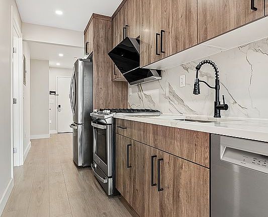 The graciously sized front and rear one- and two-bedroom layouts incorporate carefully considered design elements, highlighted by wide plank waterproof MFB flooring and oversized double pane windows that invite abundant natural light and frame views of the outdoor streetscape. Well-proportioned to maximize space, you’ll find these residences are your canvas to truly make your own. The refined palette of neutral materials together with expert craftsmanship creates residences that are welcoming and tranquil. For added convenience, each residence features an in-unit washer and dryer. Advanced Mitsubishi heating and cooling units ensure year-round comfort.