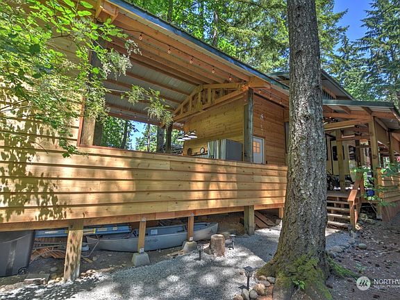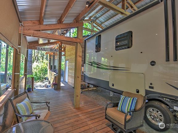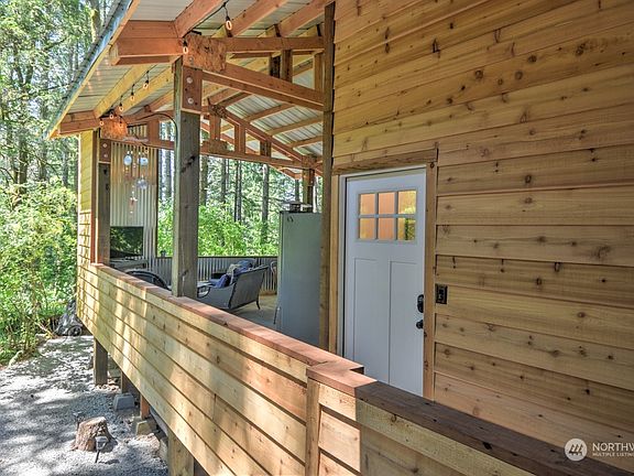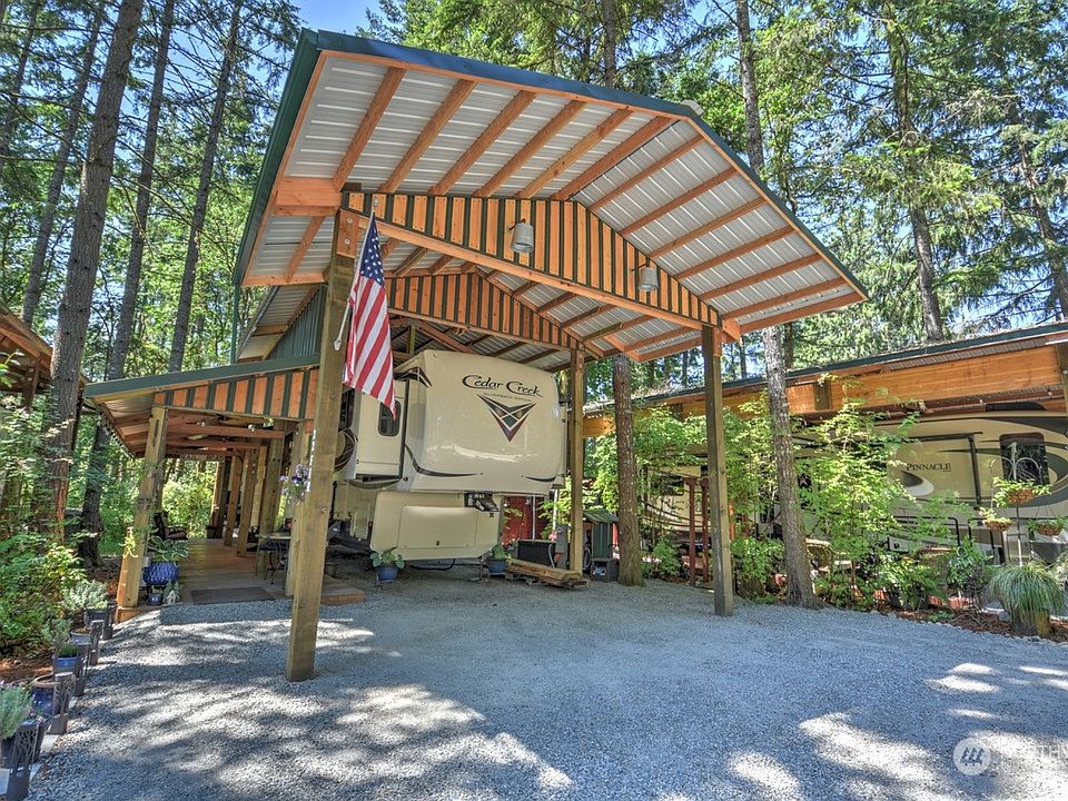 Discover the allure of 22 Fir 2780 sq ft lot with a pole barn cover/covered deck, complemented by a recently built, exquisite full outdoor kitchen with SS appliances and electric fireplace. A bathroom featuring a walk in jetted tub and a laundry room to enhance the site's amenities. This addition ensures private outdoor BBQ's and entertaining. Capture breathtaking views of the forest and a peek-a-boo glimpse of the Olympics. COA perks encompass an indoor/outdoor pool, hot tub, sauna, well equipped gym, pool table, pickleball, mini golf, playgrounds and hiking trails. The clubhouse hosts community events creating a hub for swimming, fishing, kayaking at the captivating Lost lake. Experience comfort and recreation in this enchanting setting.