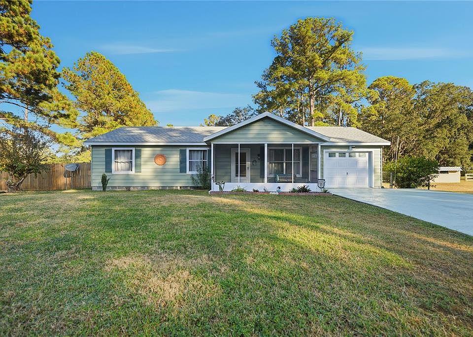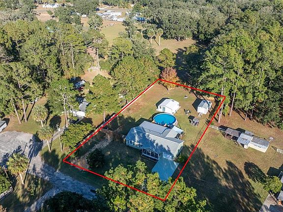 HALF ACRE LOT! WORKSHOP! 27' ABOVE GROUND POOL! CUL DE SAC! FRESH EXTERIOR PAINT! This charming 3-bedroom, 2-bathroom home offers 1,008 sq ft of living space on a spacious 0.51-acre lot. A welcoming 5' x 18' screened front porch leads into a bright, open living area. The kitchen features abundant cabinets, plenty of countertop space, and stainless-steel appliances. The primary bedroom includes an ensuite bath with a marble-top vanity and tiled tub/shower. Guest bedrooms are bright with generous closets, and the guest bathroom has a tile surround with fiberglass shower. Luxury vinyl plank flooring (2019) flows throughout. A rear slider opens to an over 550 sq ft Florida room with insulated metal roof, vinyl windows, and window HVAC, overlooking the above-ground pool with 12' x 16' wood deck. The fully fenced backyard also offers an extended brick paver patio with sail cover, perfect for relaxing or entertaining. A standout feature is the 20' x 20' workshop with full power, LED lighting, and solar ventilation fans, ideal for hobbies, storage, or projects. Additional storage includes a shed. Recent updates: 2019 (interior paint, flooring, outlets & switches), approximate 2020 pool and deck, 2021 (HVAC), 2023 (roof). Located minutes from downtown Fort McCoy with groceries, medical offices, hardware, gas, and dining nearby. Outdoor enthusiasts will enjoy a quick 5-minute drive to the Ocala National Forest, 3-minute drive to the Ocklawaha River, 3-minute drive to the Ocklawaha Canoe Outpost and Resort. Silver Springs State Park, Rodman Reservoir, and nearby natural springs—perfect for boating, fishing, hiking, and kayaking. All furniture is negotiable. Call and make your appointment to see today!