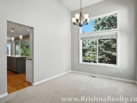 * Elegant formal dining space features a vaulted ceiling a contemporary dining room chandelier and large wood wrapped windows letting in tons of natural light