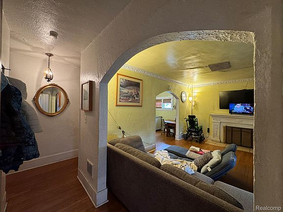 Classic Detroit brick bungalow offering exceptional potential for an owner-occupant or investor. Enjoy a spacious living room with coved ceilings and a wood-burning fireplace, a formal dining area, and a functional kitchen with ample cabinet space. A 3-season room off the kitchen provides additional flexible living space. The home features two main-floor bedrooms and two upper bedrooms, allowing for versatile use. A Covered front porch and a full basement with walkout access offers even more room for storage, future finishing, or the possibility of an additional bedroom. Home includes a generator hookup for added peace of mind. Large fenced yard with rear accessibility ramp. Newer high-efficiency Trane furnace. Conveniently located near parks, schools, and major roadways. Sold as-is—bring your ideas and make it your own!
