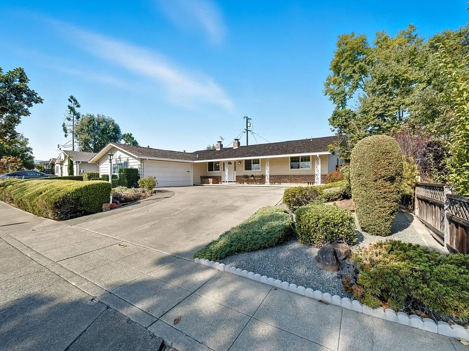 Tucked away on a peaceful street, this classic, beautifully maintained home combines timeless charm with a thoughtful layout. With a generous-sized family room and open living room, the home is perfect for entertaining. The spacious kitchen, complete with a dining area, stainless steel appliances and indoor brick barbecue offers ample cabinet space and is perfect for the home chef. The adjacent family room provides views of the landscaped yard with a large sliding glass door, while the expansive living room offers a cozy fireplace and picturesque windows. Four spacious bedrooms lead to an updated hall bath with dual sinks, granite counters and modern finishes. The primary suite features dual closets, a vanity area, and a sliding glass door to the backyard. Its renovated bathroom boasts dual sinks, frameless shower doors, and stylish fixtures. Additional features of the home include dual-paned windows, AC and new interior paint. Outdoors, the private backyard is perfect for relaxing, featuring paved patio areas, a green lawn and an abundance of mature fruit trees. Located on a peaceful street within the sought-after Cupertino school district, this home has it all and is close to shopping, dining, parks and provides easy commute access to leading technology companies.