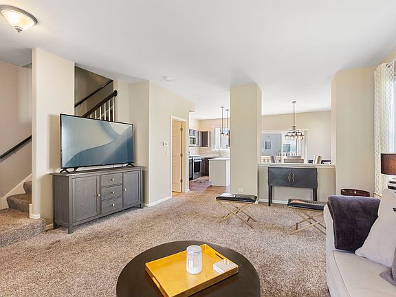 Sensationally Captivating End-Unit Townhome with Tons of Desirable Updates! Nestled in a highly-sought after area only steps from Vineyard Park, this 3BR/2.5BA residence warmly welcomes with a classic exterior color scheme and beautifully manicured landscaping. Bursting with natural light, the main-level offers an entertainment-friendly floorplan with plenty of room for guests. Explore to discover a spacious living room with soft carpet, fresh neutral paint (living room, kitchen, and bathrooms-2024), and an open concept kitchen featuring stainless-steel KitchenAid appliances, breakfast bar island, gas stove, and a dining area. Sliding glass doors lead to a cozy raised deck, which may be perfect for sipping morning coffee or evening wine. Conveniently situated on the upper-level, the oversized primary bedroom affords ample relaxation with a walk-in closet and an attached en suite boasting a step-in shower and storage vanity. Two additional upper-level bedrooms delight with dedicated closets, while the full guest bathroom ensure multigenerational versatility with a shower/tub combo and a storage vanity. As a bonus, the basement provides flex space with a sitting room/potential home office. Additional considerations include an attached two-car garage, upper-level laundry, NEW water heater (2024), NEW A/C compressor (2023), new basement floors (2024), only 47-miles to Downtown Chicago, close to park w/playground, shopping, restaurants, and schools, and more! Call now for a tour!