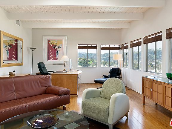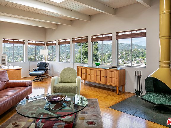 Built in 1965, this is the midcentury modern you've been waiting for. Is it possible one property could have so much to offer? The spacious home is located on a peaceful hillside road, enjoying an incredible lot that takes in views and yet still has a sparkling pool and flat yard area (yes, at a hillside home!). Inside are 4 bedrooms and 2 baths, with a formal living room upstairs that has corner windows with sunset views to die for and a cool freestanding fireplace. The master bedroom also has views and a huge bath with separate shower and spa tub, shared with the second bedroom. Downstairs is an open concept kitchen with large center island, dining area, and sitting area, making it very easy to hang out with the cook or flow out to the deck. Two more bedrooms (one used as a media room) and a bath are on this level. The bonus lower level has been turned into a charming studio space with its own bath, and is perfect for guests or home office. This is true California living at its best!