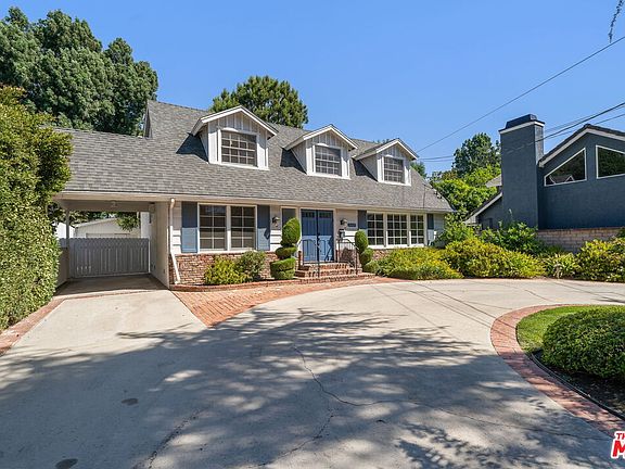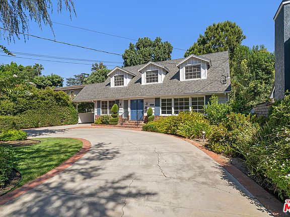 Located in the prestigious Midvale Estates, this stunning turnkey Cape Cod retreat sits on an expansive 11,000 sq. ft. flat lot with a sweeping circular driveway. Classic curb appeal is showcased through a brick wainscot facade, inviting dormer windows, while inside you'll find bright and spacious living areas with hardwood floors, an elegant grand living room and a cozy family room. The gourmet kitchen boasts Corian countertops, a custom marble island and seamless flow to the formal dining and living spaces. The home features one bedroom downstairs and three upstairs, including a luxurious primary suite offering a spa-inspired bathroom and two oversized walk-in closets. The property's amenities include a dedicated laundry room, a 2-car garage plus carport, and an upgraded HVAC system. The entertainer's backyard is a private oasis featuring a resurfaced saltwater pool with new plumbing and equipment, expansive paver decking, a large grassy area, and towering mature trees that provide both beauty and privacy. Adding to the appeal, the property includes a charming 950 sq. ft. (approx.) guest house with 2BR+1BA, perfect for extended family, guests, gym, or a home office retreat. Blending timeless Cape Cod charm with modern upgrades, this exceptional property delivers comfort, style and functionality in one of the Valley's most sought-after neighborhoods.