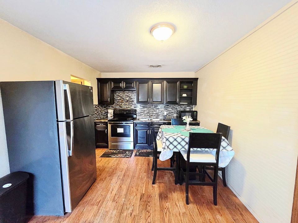 New electric rangeStainless steel refrigeratorCentral heat and airDining setCoffee makerArea rugSofa set