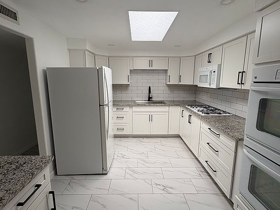 Renovated throughout with a brand new modern kitchen, white cabinets (modern black hardware) white backsplash, granite countertop, modern appliances, dual pane windows, modern white/black ceramic tile, recessed ceiling lightning, ceiling fans every bedroom (AC/heating system), covered carport/porch and block wall.