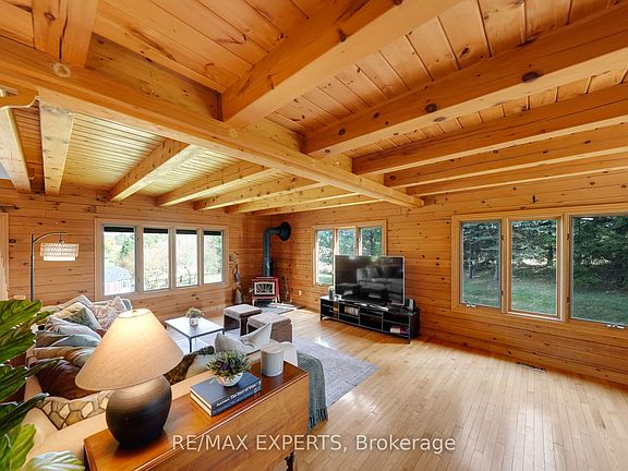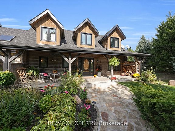 This unique log home with a spacious addition offers character, comfort, and incredible views -- including the CN Tower from the front porch! Set back from the road on a private lot, it features natural gas, municipal water and fibre optic internet, and a huge triple garage. Ideal for multi-generational living or income potential, the home includes two self-contained apartments with separate entrances. The upper unit (renovated in 2020) is bright and full of storage, while the lower-level unit has a sauna and its own parking and walkout to yard/patio. The main home boasts a window-lined living room, loft-style dining with skylight overlooking the billiard room, multiple walkouts, updated baths, and hardwood/tile floors. Recent updates include: roof (2022), furnaces & AC (2022), Windows/slider (2020), fascia & eaves (2024), municipal water (2022/23), new landscaping, baths, and flagstone walkway (2024). Originally built in 1998 with an addition in 2004/05, this lovingly cared-for property is perfect for families looking for space, privacy, and room to grow! A unique opportunity in the most perfect location!!
