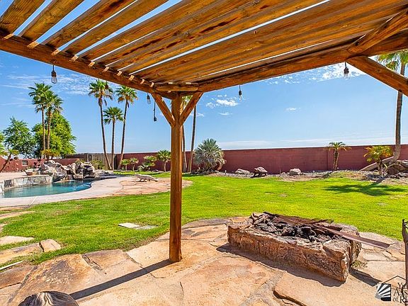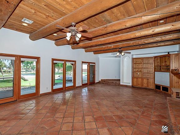 Welcome to your private resort oasis on 4.5 acres—where luxury, comfort, and functionality come together. This stunning 3,289 sq. ft. Santa Fe–style home features 3 bedrooms, 3 bathrooms, and a 3-car garage, designed with rich wood detailing, natural trim, soaring beams, and beautiful tile flooring throughout. The gourmet kitchen boasts granite countertops, while the spacious primary suite offers a large soaker tub, separate shower, and dual vanities. Enjoy serene outdoor living with expansive front and back covered patios, a sparkling self-cleaning heated pool with spa, a pergola, lush green lawns, mature trees, and palm-lined landscaping. A spectacular pond with a dramatic waterfall, fish, and its own bridge creates a breathtaking centerpiece. For those who need space to create, store, or entertain, the property includes an impressive 5,000 sq. ft. workshop complete with its own septic, additional garage space, 2 rooms, a full kitchen with bar, and a bathroom—perfect for hosting, hobbies, or big projects. Additional highlights include 3 fireplaces, irrigation water, a private well, and full property fencing for security and privacy. With its blend of elegance, resort-style amenities, and practical upgrades, this estate is truly one of a kind!