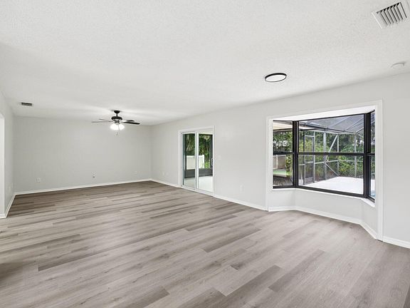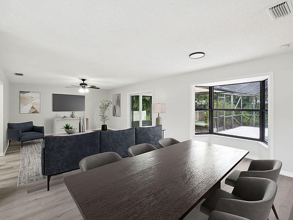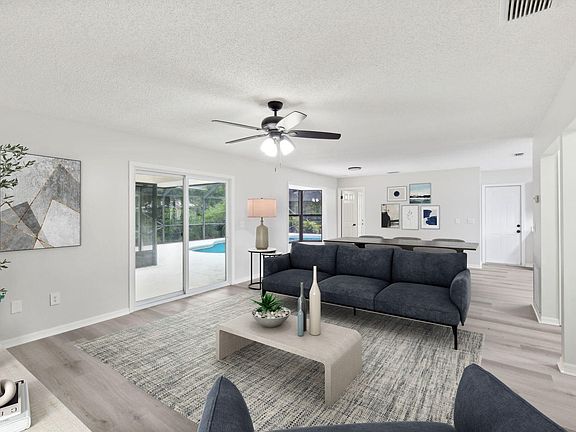 Welcome to your dream home! This beautifully updated residence features a fenced-in backyard with a sparkling, screened-in pool and a spacious patio--perfect for relaxing or entertaining. Inside, you'll appreciate the brightness from natural lighting, with features such as luxury vinyl plank flooring, new lighting and ceiling fans throughout. The split floor plan ensures privacy and comfort for everyone. The guest bathroom boasts a sleek new vanity with quartz countertops and modern lighting. Each bedroom has plush new carpet, adding to the home's cozy atmosphere. The updated kitchen is a culinary delight with new cabinetry, quartz countertops, and stainless steel appliances, including a range, microwave, and dishwasher, all open to the living room for easy interaction. The master bedroom offers a new ceiling fan, and the ensuite features a new vanity with quartz countertops and updated lighting. The garage has been freshly painted, adding to the home's overall appeal. Don't miss out on this move-in-ready gem! Book a private showing today.