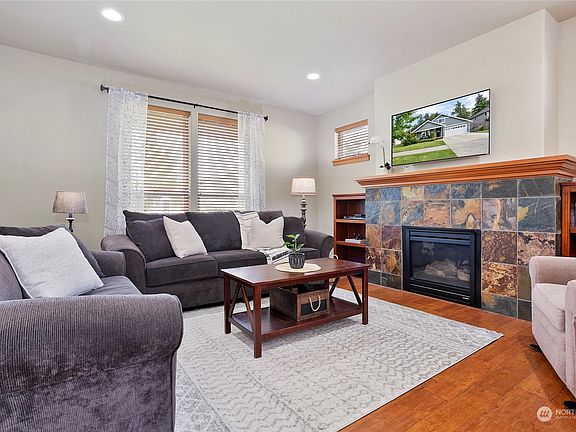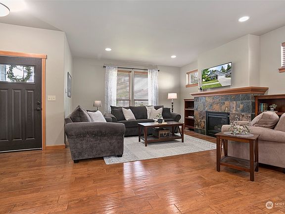 Immaculately kept spacious home in desirable location backing to KOA trees/greens & central to all 3 local school levels. Pride of ownership shines in this over 2,500 sq ft home w/beautiful wood cabinets & granite in kitchen, open to dining & main floor living room. Owner's suite on main floor w/large ensuite bath & walk in closet. 2nd of 3 bdrms on main is huge! Cozy gas fireplace w/slate surround in living room, perfect for PNW winters. Outdoor spaces are an entertainer's dream - huge gazebo for covered year-round enjoyment, plus cozy firepit space, patio off owner's suite (hot tub spot?), fruit trees, garden space, + no back neighbors. Topped off w/AC, inground sprinklers, shed, & tons of space upstairs, this one is a must see!