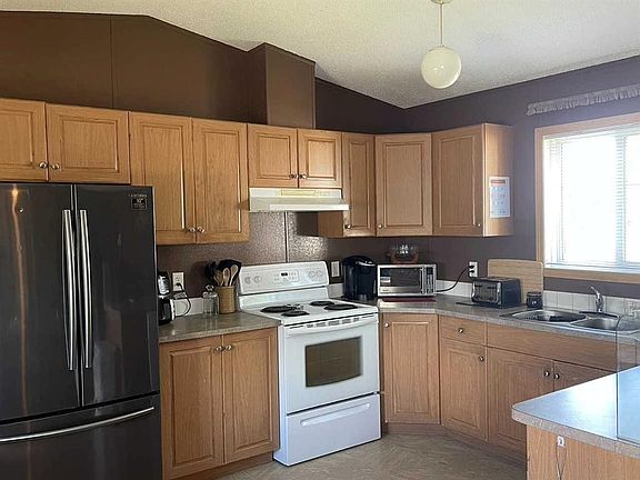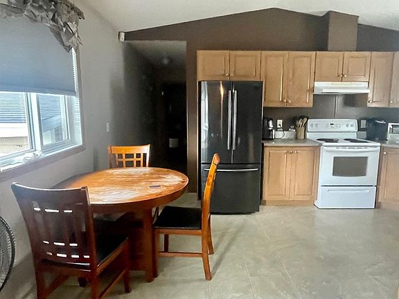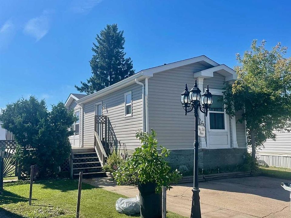 Welcome to this well maintained manufactured home built in 2007, offering comfort & convenience in a peaceful setting. 1,152 sq.ft. residence features a bright & open-concept layout that seamlessly connects living room, dining area & kitchen making it ideal for both family living & entertaining. The home offers 3 spacious bedrooms & 2 full bathrooms. The kitchen comes equipped with all the essentials: fridge, stove, dishwasher with the added bonus of a washer, dryer & deep freezer in the separate laundry room. For those looking for a move-in ready option, some furnishings such as beds, a leather couch & loveseat, TV's & dining furniture may also be included. Step outside to enjoy two decks, a large front deck perfect for gatherings & a cozy back deck well suited for a bistro set. The yard includes two handy sheds for extra storage & a front concrete driveway with space for two vehicles. Situated in a quiet, mature cul-de-sac close to splash park, this property offers a wonderful blend of tranquility & convenience. Listed at an attractive price, this home presents an excellent opportunity for first-time home buyers, downsizers or anyone looking for a welcoming space in a family-friendly neighborhood.