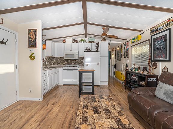 Live the Leucadia lifestyle—at a fraction of the cost—at Trailer Rancho! Situated west of the freeway and across the railroad tracks from all the restaurants, beaches, shops, and businesses that make Leucadia a world class destination (plus two planned pedestrian railroad crossings) Trailer Rancho is an enviable location to enjoy all on offer in this special place. Space #58 is a well maintained home that lives larger than its 504 square feet. High end floor to ceiling windows provide plenty of natural light and air flow and the oversized shower is something out of a luxury home. Recent improvements include a new roof, tile backsplash, entryway fence, engineered hardwood flooring, and an oversized storage shed form surfboards, bicycles, and beach toys. In unit, stacking washer and dryer adds convenience (no trips to the park’s laundry room). Land lease is $1581 per month. Trailer Rancho park is owner occupied only.