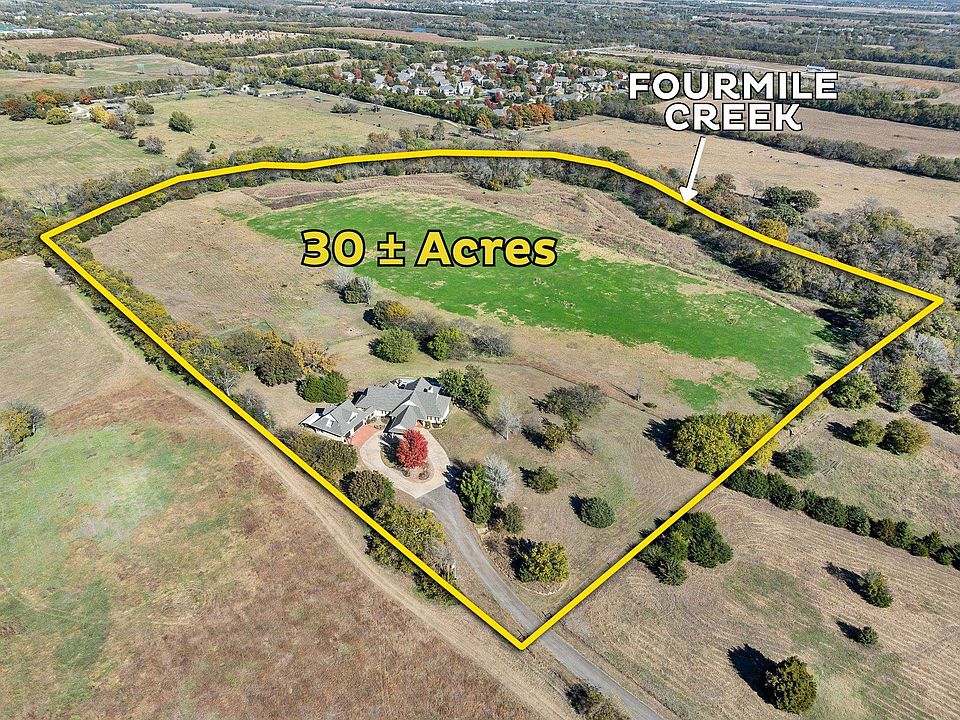 ONLINE AUCTION! 30 ± Acre Luxury Estate | Across from Flint Hills National | Fourmile Creek | Heavy Timber | Saltwater Pool | Scenic Views | Trophy Whitetail & Turkey Hunting | Guest Quarters | Secluded Setting | Andover Schools | Quick Access to Wichita & Andover Amenities. Bidding Ends: Friday, December 12th @ 12:30 PM. Location: 15490 SW 120th St, Andover, KS 67002. Exceptional opportunity to purchase this 30 ± acre private estate located directly across from Flint Hills National Golf Club in the highly sought-after Andover School District (Andover Central) (USD 385). This rare property combines luxury living, recreational privacy, and convenient access to both Andover and East Wichita amenities. Nestled among mature timber and the scenic Fourmile Creek, the setting offers a retreat-like atmosphere with abundant wildlife, trophy whitetail and turkey hunting, and sweeping views from multiple outdoor living spaces. The home provides over 5,900 square feet with six bedrooms, five full and two half bathrooms. The upper level, including guest quarters, features 3,773 finished square feet, while the basement adds another 2,078. Originally built in 1993, the home has been exceptionally maintained with hardwood floors, granite countertops, a gas range, tile walk-in showers, and a basement wet bar. Additional highlights include three wood-burning fireplaces, a main-level laundry and pantry, heated oversized three-car garage, front covered parking area, and a composition roof replaced about eight years ago. Outdoor living is at the heart of this property, featuring a saltwater pool with automatic cover (liner & cover replaced in 2021), expansive patios overlooking the creek, timber, meadow and wildlife. Major updates include new windows, driveway and drainage enhancements, pool system upgrades, lighting and electrical improvements, interior painting, radon mitigation, and remodeled half baths. With rural water, lagoon, and leased propane tank (Wayman Oil), paved frontage, and abundant wildlife, this Andover estate offers an unmatched blend of luxury, privacy, and outdoor recreation. Buyers are advised to thoroughly review the terms and details provided on the online bidding site, as any terms, comments, or announcements made there supersede any other advertised material. The property is being sold in its current "Where Is, As Is" condition, without any warranties. Sale is subject to seller confirmation with closing within 30 days. The successful bidder must immediately execute the provided auction purchase contract and deposit $50,000.00 as earnest money within the specified time outlined in the contract. Additionally, a 10% buyer’s premium will be added to the final bid price. This auction is conducted exclusively online, with a 2-minute bidding time extension. The auctioneer reserves the right to recess, adjust and/or extend the bidding time as they deem necessary. Furthermore, the auctioneer may, at their sole discretion, reject, disqualify, or refuse any bid. Broker forms, if any, are available on the bidding site. While all information is deemed reliable, buyers are encouraged to conduct their own due diligence. The sale is not contingent on financing, appraisal, or inspection, and the winning bidder must be available immediately post-auction. The property is sold subject to applicable Federal, State, and/or Local Government regulations, with all measurements and details approximate and non-binding. The auctioneer provides no warranties regarding the online bidding platform's performance and assumes no liability for any bidder-incurred damages during its use, including unacknowledged bids or errors. Bidders accept all risks associated with the platform and acknowledge that the auctioneer bears no responsibility for bid submission or acceptance errors or omissions. Auctions may be subject to selling prior to the auction date. The driveway into the property is a legal easement and is solely maintained by the sellers.