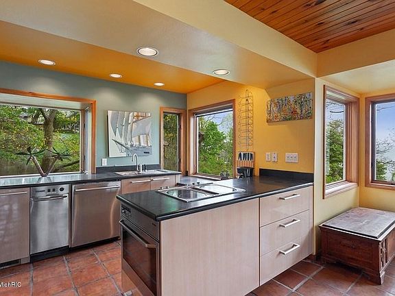 This captivating Lake Michigan frontage modern home, designed by acclaimed Architect Stephen Rankin, resides in an enchanted wooded dune setting. Take in the sweeping lake views with 2000 sq ft of cantilevered decks and a rooftop lookout. The home features three bedrooms and three baths. The master bedroom includes a moon dome perfect for stargazing. Prepare your meals and entertain in the gourmet German Poggenpohl kitchen with Miele & Fisher-Paykel appliances. There are two wood-burning fireplaces, a cozy screened porch, and spectacular views from every window. Take your private tour today!