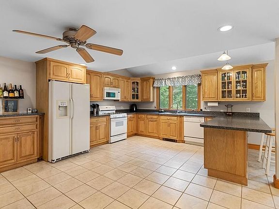 - Kit Dscrp: Main Level, Ceiling Fan(s), Cabinets - Upgraded, Flooring - Stone/Ceramic Tile, Recessed Lighting, Remodeled, Country Kitchen, Peninsula, Ceiling - Half-Vaulted