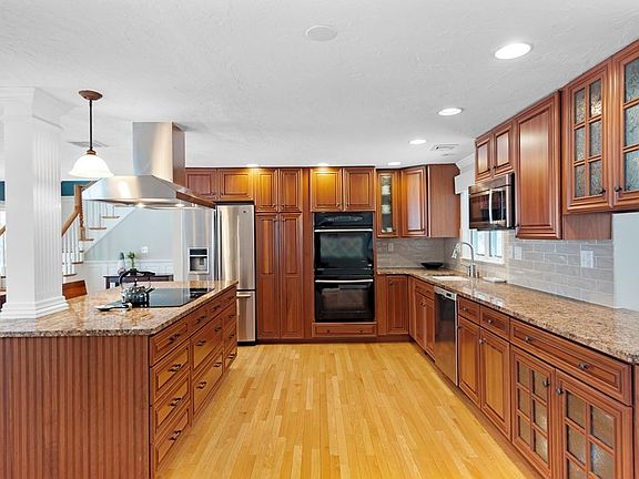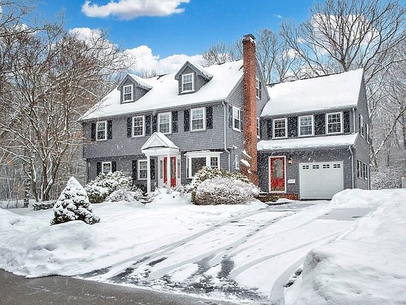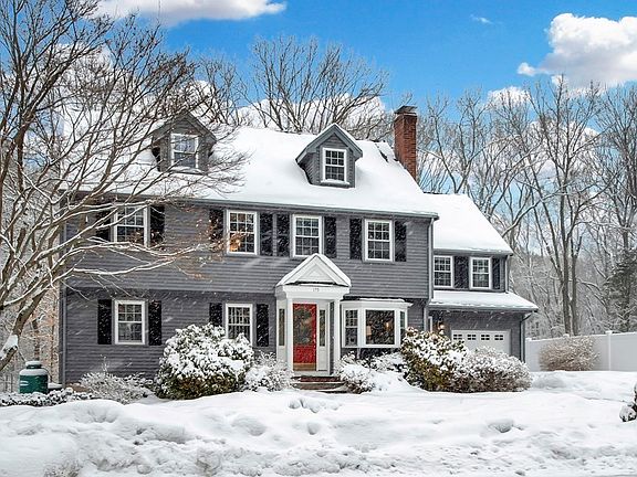 Whether looking onto a winter wonderland or a colorful blaze of fall foliage, this corner home offers privacy and tranquility as well as the conveniences of shopping along nearby High Street. Step into a welcoming sitting area with a bay window overlooking the front yard and a wood burning fireplace. The open concept kitchen dining boasts rich wood cabinets, granite counters, tiled backsplash, double ovens and vent hood. The dining room gets flooded with light as well as overlooks the big back deck and yard. Relax in your large formal living room, or head down to the finished basement, with wall to wall carpeting to keep the feet warm on cold winter days. The second floor holds a sumptuous master suite with vaulted ceilings, ensuite bath and double closet. Three other good sized bedrooms round out this level. Pull down ladder to a heated attic with windows and flooring for additional storage. Attached one car garage, paved driveway, washer, dryer, AC. This is a jewel not to be missed!