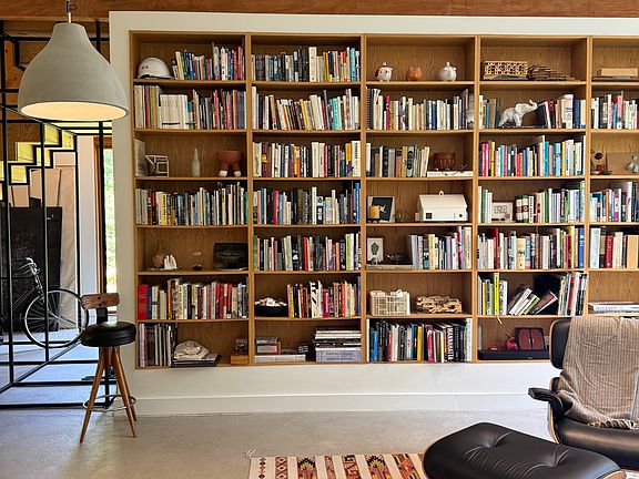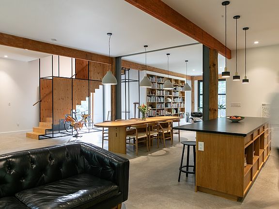 Adaptive reuse horse barnFloor-to-ceiling windowsMinimalistic yet comfort-forward furnishingsExpansive primary levelHandcrafted ash wood doorsSpacious sitting areaGuest bedroom