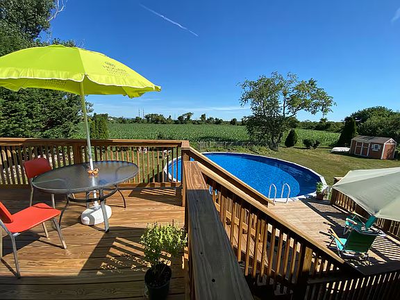 Step outside and enjoy your wooden deck overlooking the large sky/large yard and pool area, a perfect space for lounging or entertaining friends and family. The home sits tucked away on a peaceful cul-de-sac, has a two-car garage, shed for storage, and backs onto a scenic land trusted farm for added privacy. The cornfield is owned by our dairy farmer friends, producing cow feed corn for the last dairy farm on the island (predominantly downwind from the house!). Raised garden beds. Incredible sunsets and sunrises thanks to lots of open space.