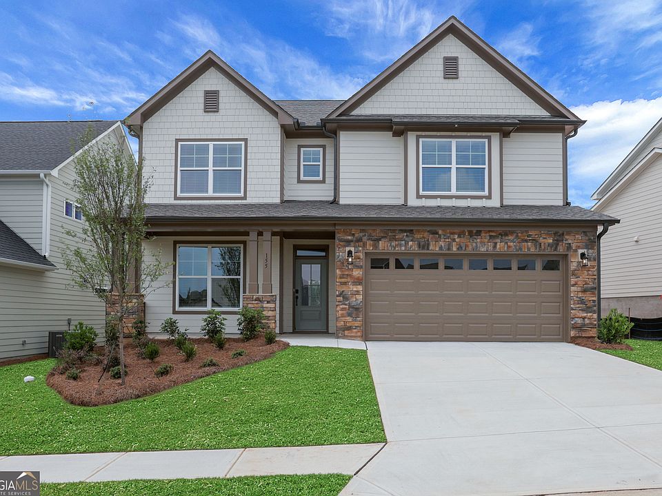 Move-in ready, this Davidson floor plan by Eastwood Homes offers five bedrooms and three full baths, thoughtfully designed for both style and function in the sought-after Twin Lakes community. The main level includes a guest suite with a walk-in shower and seat, perfect for visitors. The gourmet kitchen showcases white cabinets, quartz countertops, a shiplap hood vent, and a 5-burner gas cooktop, and connects seamlessly to the formal dining room through a butler's pantry. A bright sunroom extends off the breakfast area and overlooks the green backyard, while the open-concept living room features a floor-to-ceiling stone fireplace as its focal point. Upstairs, the primary suite features a coffered ceiling, a spa-like bath with a large shower and seat, and a walk-in closet with direct access to the laundry room. A spacious loft anchors the upper level, surrounded by large secondary bedrooms with plenty of natural light. Exterior highlights include architectural shingles, HardiePlank siding, and stone accents for timeless curb appeal. At Twin Lakes, residents enjoy lakes, a pool, clubhouse, fitness center, dog park, and more-all just minutes from shopping, dining, and I-85. Receive $6,000 towards Closing Costs with Builders Lender, Sabal Mortgage.