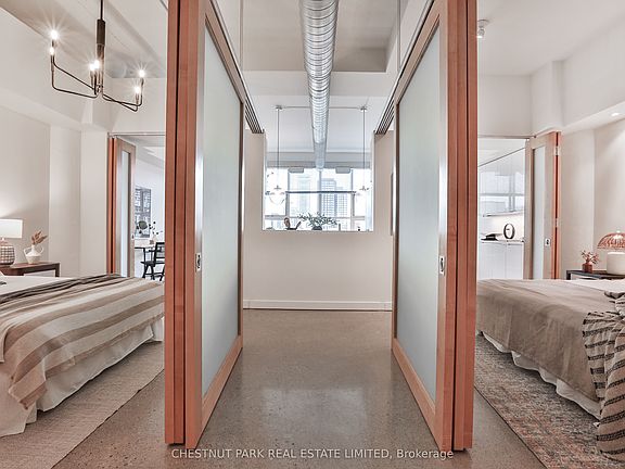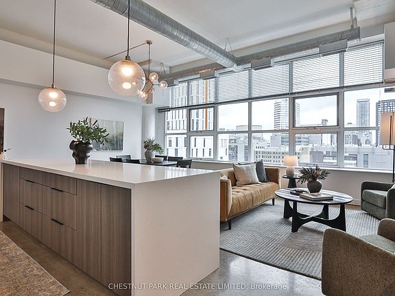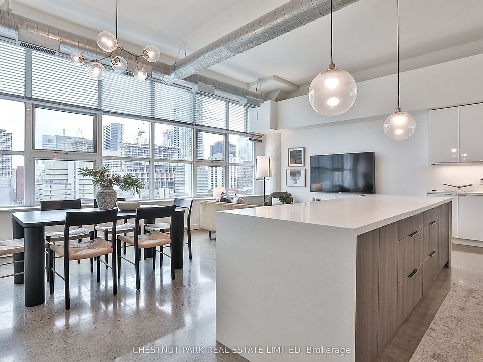 Discover authentic hard loft living at the iconic Merchandise Lofts! An exceptional opportunity to own a turn-key residence in one of Toronto's most celebrated warehouse loft conversions. Perfectly situated in the dynamic Church-Yonge Corridor, just steps to shops, restaurants, TTC and Toronto Metropolitan University. Suite 1013 is a sun-filled loft offering 1,281 sq ft of contemporary living space and unobstructed west views of the city. Beautifully renovated and meticulously maintained, this suite showcases a striking aesthetic with soaring 12 ft ceilings, expansive warehouse-style windows, polished concrete floors and exposed ductwork. The versatile 2 bedroom layout features gorgeous sliding doors and a spacious open concept living and dining area ideal for both entertaining and everyday living. The chef's kitchen impresses with a large quartz waterfall island, breakfast bar, stainless steel appliances and built-in sideboard perfect for a coffee or cocktail bar. The primary suite includes a large double-door closet and a renovated 3-piece ensuite bathroom with an oversized glass-enclosed shower and custom vanity. The spacious second bedroom offers a double-door closet and has access to another stylish 3-piece bathroom. Additional highlights include a walk-in laundry room with built-in cabinetry, excellent in-suite storage and 1 parking space. Superbly renovated with high-quality finishes and true hard loft details throughout, this spectacular suite offers the perfect blend of style, comfort and convenience - right in the heart of the city!