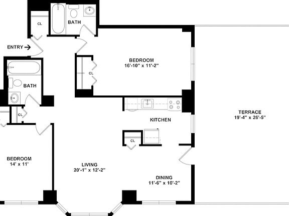 Generous closet spaceEntry foyerSpacious terraceDining alcoveBright two-bedroom corner unit
