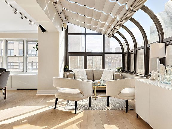 A separate dining area is spacious enough for the largest of dinner parties, and an additional solarium space creates options for bonus living space, a breakfast nook, or a gallery, all with stunning southwest exposures and city views, including the Empire State Building. The generously sized setback terrace is accessed from the solarium and the primary bedroom.