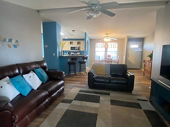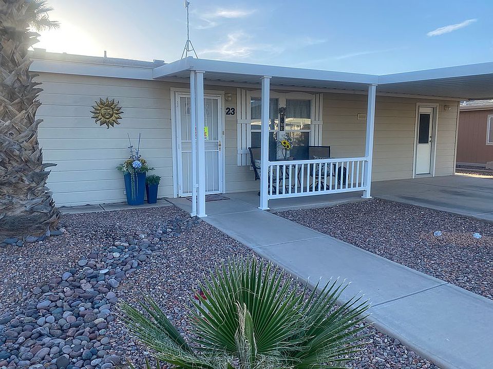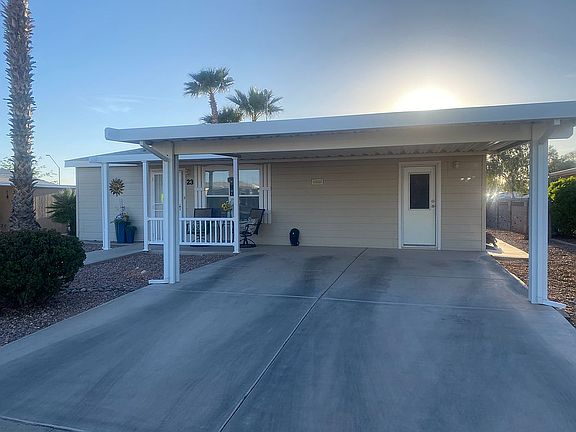 Retired or not, you will enjoy living in this beautifully updated home in the small 55+ community of Rodeo Estates in Casa Grande, Arizona. Updates are less than a year old and include wood-look vinyl plank flooring throughout, SS kitchen appliances, and interior paint. The heat pump/AC is approx. 4 years old, and the walls are taped and textured. With vaulted ceilings, the home feels spacious and open. The bedrooms are split, and one has an ensuite with walk-in shower and a walk-in closet. The convenient laundry room has cabinets, clothes drying rack, and includes the washer and dryer. Ceiling fans and Thermopane windows with miniblinds installed throughout the home. A sliding door off the great room leads to a screened and tiled Arizona room and covered access to an airconditioned storage room. Exterior windows have removable sunscreens. The home sits on a perimeter lot with privacy block fencing. The low maintenance yard features several palm and shade trees, flowering shrubs, and desert plants. The generously sized backyard has a covered patio and built-in firepit. The 2-car covered carport allows for side-by-side parking. Affordable living with lot rent at only $540 mo. Rodeo Estates has an after-dark security gate, clubhouse with pool tables, card room, library, fitness room, heated pool and spa, shuffleboard, several active clubs, and many fun social events to attend. All residents must be park approved. For more information, contact Eric @ (520) 560-6065.