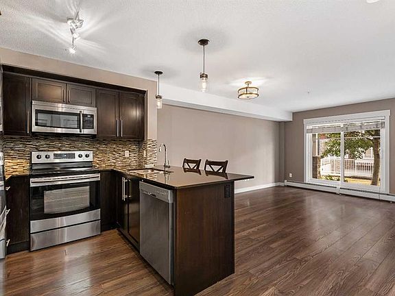 Welcome to this beautifully designed main-floor one-bedroom condo in the desirable community of Skyview Ranch. This bright and well-maintained home offers a perfect blend of comfort and functionality with private ground-level access and green space right outside your patio — ideal for enjoying morning coffee or walking your pet. The open-concept layout features a modern kitchen with rich espresso cabinetry, granite countertops, tile backsplash, stainless steel appliances, and a peninsula island with a seating bar — perfect for casual dining or entertaining. The living area is spacious and inviting, filled with natural light through large windows and sliding doors to the patio. The bedroom includes double closets, while the full bathroom offers a contemporary design with an oversized vanity and sleek finishes. Additional conveniences include in-suite laundry, titled underground parking, and an assigned storage locker. Located close to Stoney Trail, Deerfoot, shopping, schools, and parks, this move-in ready home offers both lifestyle and value in a well-managed complex.
