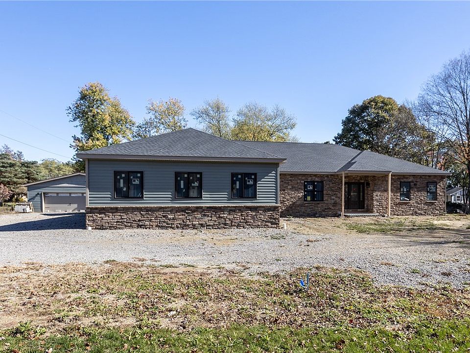 A rare opportunity to create your dream home! This spacious 3,537 sq ft ranch is already framed and ready for your custom finishes—work with the existing builder or complete it yourself. Enjoy true one-level living with 9' ceilings, wide hallways, and an open layout featuring a cathedral great room, kitchen, and dining area. The expansive primary suite offers a luxurious ensuite bath and an oversized walk-in closet that will impress. Three additional bedrooms provide plenty of flexibility—two feature their own private ensuites. The exterior is finished with stone and siding, black-trim Anderson windows, and a 2-car attached garage. The full basement boasts 11' poured walls, offering 4,361 sq ft of potential with 10' finished ceilings. An additional detached 2-car garage with a large workshop adds even more space. Set on nearly a half-acre lot, this home offers the rare chance to personalize high-end new construction exactly to your taste! All utilities ready at curb.