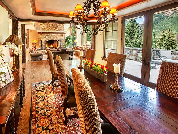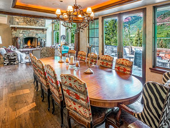 Enjoy this year-round home that overlooks the expansive Maroon Creek Valley and offers mountain seclusion, but just a two-minute walk away from Aspen Highlands' slopes! This home offers the perfect summer base to explore local's favorites including the world-renowned Maroon Bells. When you are ready to unwind, the sound of the Maroon Creek beckons you to the back terrace which is equipped with a gas fire pit, outdoor heaters, hot tub and barbecue! Every room on the main level walks out to the back terrace! This stone estate is ideal for family gatherings or corporate entertaining. The living room is elegant and comfortable with a large floor to ceiling fireplace, two story windows that bring the outside views inside and a great room that includes space for dining or gathering. On the main floor is the master suite with large bathrooms and walk in closets. Adjacent to the master is a full office. The great room has a formal dining area with expansive views which leads into the large chef's kitchen and kitchen dining area. Three guest suites upstairs and on the lower level is a wet bar, media room, billiards area, a bunk room that sleeps four people and yoga room. Just walk out your door and across the street to access the many amenities that come with living at Highlands, skiing, spa, outdoor pool, hot tub and dining. You can even catch the bus to other ski areas if you don't want to drive. This home is approximately 9,010 square feet including garage. Master King * King * Queen * 2 Twins * Bunk room with 4 twins.