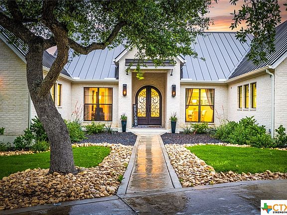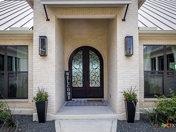 Nestled in the amazing landscapes of the Texas Hill Country, this single-story haven sprawls gracefully over two acres within the Peninsula at Mystic Shores, offering a serene peek-a-boo vista of Canyon Lake. Luxurious yet welcoming, the home features three bedrooms and three and a half bathrooms, ensuring comfort and convenience for all. The kitchen stands as a pinnacle of elegance, boasting a 10x6 colossal island and sleek marble countertops, seamlessly blending style with functionality. Notable additions include a pull-out mixer cabinet, a built-in Sonic ice maker, and top-of-the-line Thermador Appliances including a 48-inch refrigerator freezer. Additionally, there is a water filtration system with reverse osmosis at the kitchen sink ensuring pure, crisp water for everyday use. Each bedroom boasts its own ensuite bathroom, and all showers are generously oversized. The primary bathroom exudes luxury including a a built-in curling iron station with power outlet for added convenience. The primary closet is not to be overlooked, featuring its own island for organization and ease. The residence is further enhanced by its expansive backyard, where indoor and outdoor living harmonize effortlessly through a stunning 16-foot-long sliding door with a 12-foot opening, welcoming gentle breezes, and panoramic views. An outdoor kitchen, currently under construction and set to be completed by June, spans 14 feet, promising delightful culinary experiences under the open skies. Adding to its charm, the front of the home is adorned with six gas lanterns, casting a warm glow upon an evening arrival. There is plenty of room for all your vehicles and lake toys in the oversized, side entry, 3-car garage. Call today if you are ready to embrace a lifestyle of unparalleled comfort and refinement, this hill county retreat can be yours!