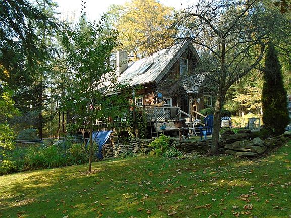 Hidden Gem'' - log cabin on dead end road with cathedral ceiling, massive stone chimney, solid oak kitchen, office space, wine cellar, four season sun room, large deck with a retractable awning, central vacuum, hot tub and mostly new windows. Open lofts on each end of the home with sleeping areas in each. This home was built with larch logs that are naturally resistant to decay. House has a walk out basement with dog run, new efficient wood furnace and an oil furnace. Open and wooded 9.73 acre lot with creek, small wildlife pond shared with neighbor, perennial beds, vegetable garden, fruit trees, hops, kiwi tree and more! There is also a two story 30' x 50' pole barn with room for 4 cars, and a hobby greenhouse and potting shed.Antique furnishings and firewood negotiable as well as all you'll need to keep this property in showplace style!