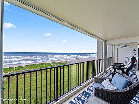 DIRECT OCEAN w/VIEWS FOR MILES! Discover luxury oceanfront living in this fully renovated 2-bedroom, 2-bathroom condo with breathtaking ocean views. Sellers spared no expense in this fully renovated, elegant retreat featuring an open-concept layout with premium finishes, including wood look tile floors and designer lighting. The gourmet kitchen boasts custom cabinetry, quartz countertops, and high-end stainless steel appliances. Wake up to serene ocean views from the spacious primary suite, complete with a spa-like ensuite featuring dual sink vanity, walk in closet, ample storage and a walk-in glass shower. The second bedroom offers comfort and privacy, with access to a beautifully appointed guest bathroom. Step out onto your private balcony to enjoy panoramic ocean views, rocket launches and sea breezes. Located in a secure building with direct beach access and close to dining and entertainment, this condo combines luxury and coastal charm for the perfect oceanfront lifestyle!