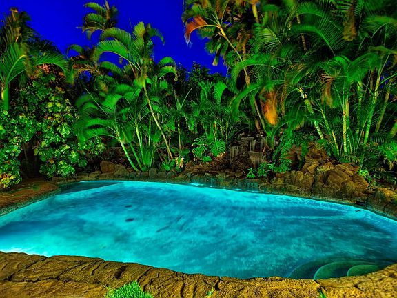 Pool and waterfallStone fireplacePrivate backyard gateHeated jacuzziRemodeled modern interiorLush tropical surroundingsVaulted ceilings