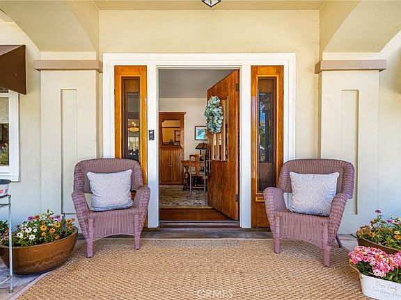 Welcome to this ICONIC 1921 Prairie Style home, meticulously designed to embody the essence of Frank Lloyd Wright's renowned architecture. Nestled on one of Old Towne Orange's most sought-after blocks, this residence is TURNKEY & sure to impress the most discerning buyer! Step inside to discover 4 bedrooms & 2 full baths, natural wood finishes, complemented by built-in cabinetry. A striking oak front door, flanked by sidelights, invites you into the warmth of the original hardwood floors. The open floor plan seamlessly connects the front living room to the formal dining room, boasting an exquisite built-in china buffet with original leaded glass, custom wood wainscoting & picture rails. The unique French doors lead to a private office/library, complete with built-in secretary, pull-out Murphy bed & ornate wood detailing including leaded glass cabinets & bookshelves. Enjoy moments of tranquility in the sunroom, featuring a coffered ceiling & full-length windows that offer serene views of the yard & pool area. A swinging door gracefully divides the dining room from the gorgeous kitchen, equipped with Wedgewood gas stove, kitchen island & wood-faced built-in refrigerator, crisper drawers & freezer. An original hideaway prep table adds nostalgia & practicality to the space, while black DuPont Zodiaq quartz countertops & shaker-style cabinets exude timeless charm. Upstairs you will find 4 bedrooms, including the primary bedroom with walk-in closet & private balcony, perfect for savoring the neighborhood view. Both bathrooms have been beautifully restored, featuring white tile, pedestal sinks, & showers over the tubs. The upstairs bathroom still retains its laundry chute, conveniently connecting to the main floor mudroom. A custom Dutch door leads to the breathtaking rear yard, featuring a remodeled resort-like pool/spa, complemented by a covered patio & numerous fruit trees. The large basement houses the updated HVAC system, water heater & ample storage space. The long driveway, graced with a Porte-cochere & side door entrance, extends to the detached garage. Recent upgrades include a NEW ROOF, copper plumbing repipe, newer rear sewer line & upgraded 200 amp electrical service panel. Fresh exterior paint & custom awnings add to the home's immaculate appeal, while the resurfaced pool/spa enhance the outdoor oasis. This property is eligible for the Mills Act property tax reduction program subject to approval. A RARE OPPORTUNITY to own this Historic Masterpiece!