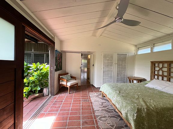 The master bedroom with queen bed opens through a large sliding door onto a private lawn, inviting guests to bask in the peaceful Hawaiian mornings. It is furnished with a queen bed, dresser, closet, and side tables, and a sitting chair for moments of relaxation. The second bedroom is furnished with another queen bed, dresser, closet, and side tables, ensuring a restful night's sleep for all guests. Linens for both bedrooms are included.