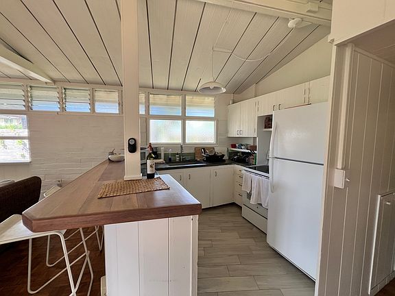 The heart of the home is an open-plan kitchen and living room that opens through huge doors onto a spacious lanai (patio) and private yard. The kitchen boasts a stylish concrete countertop, wood breakfast bar, and convenient appliances including an electric range, full-size fridge, coffee maker, microwave, and blender. The open layout encourages social cooking and dining experiences, enriching your stay with memorable moments.